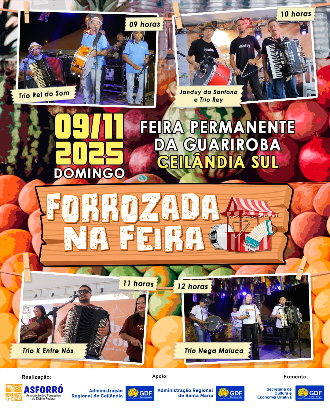 No sábado, a festa será na Feira do Guarapari (QNN 5/7), a partir das 9h da manhã, e promete animar o público até o meio-dia. Entre as atrações, estão Trio Asa Norte, Trio Forró Bijú, Jamelo e Trio Os Cobras do Forró e Chico Ceará e Trio, nomes que representam o autêntico forró pé de serra e o espírito alegre que faz das feiras um verdadeiro ponto de encontro da comunidade.