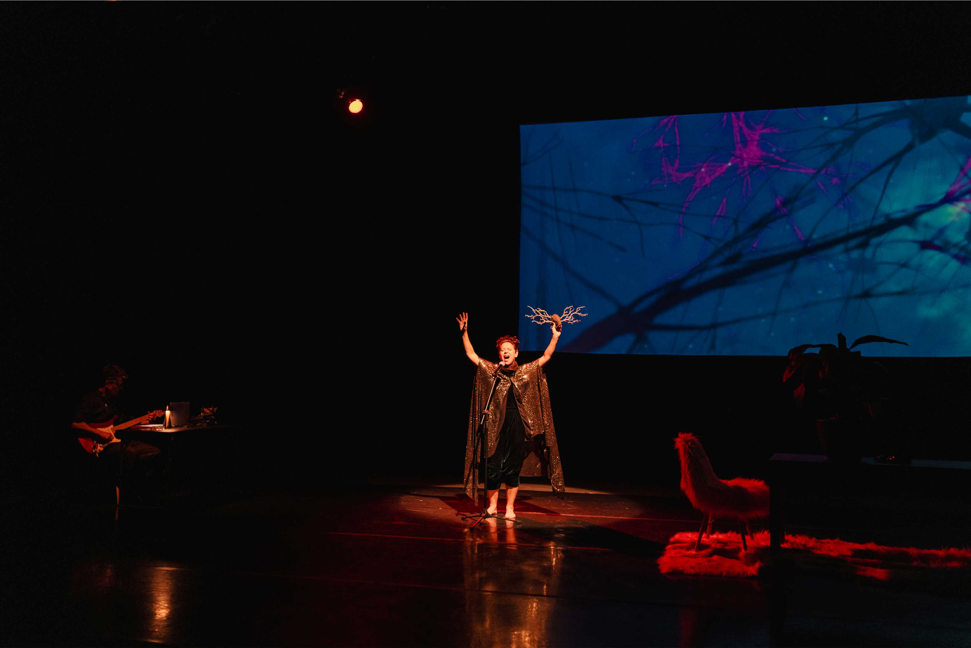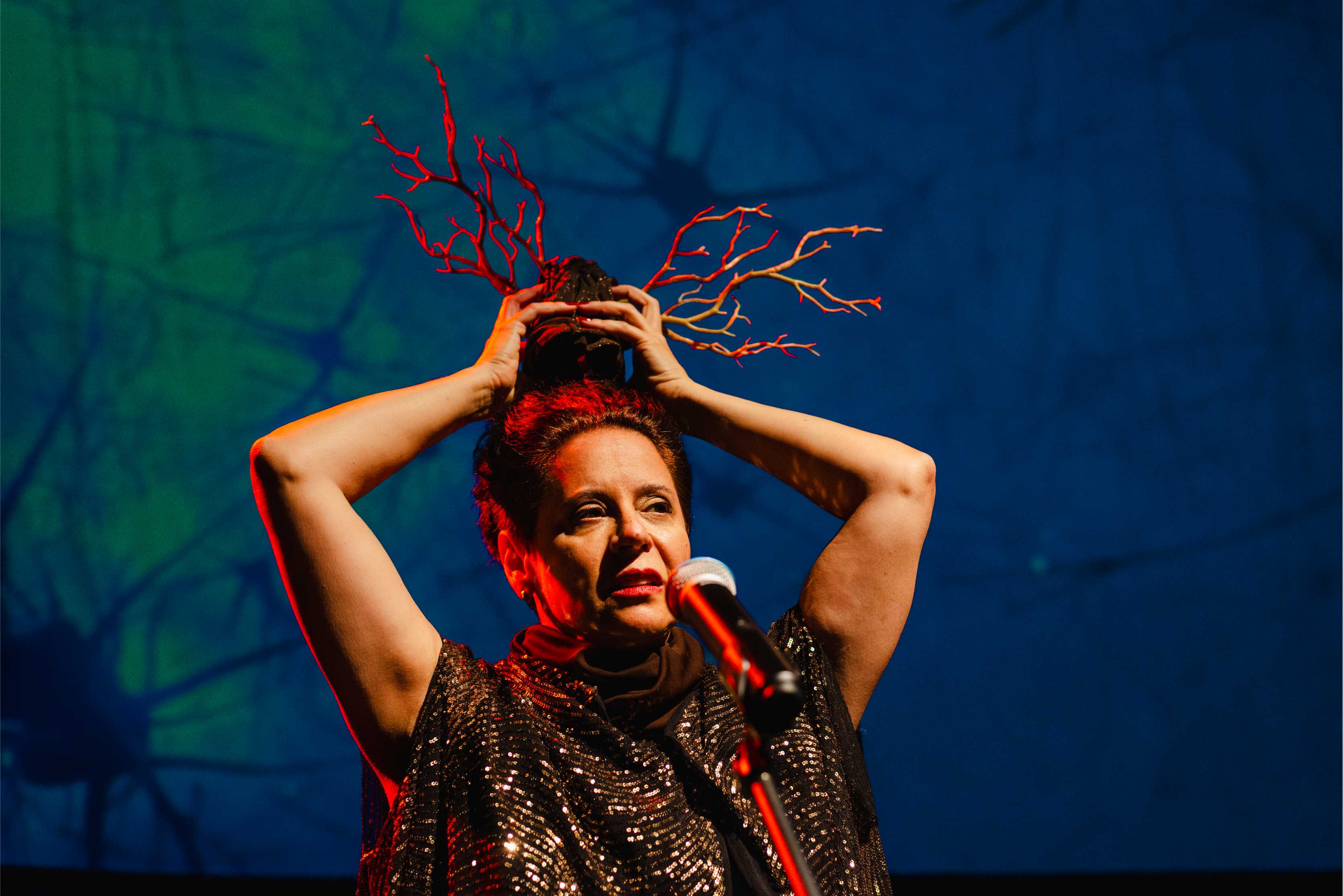 O espetáculo apresenta a figura da mulher galhada, personagem que se conecta aos mundos vegetal, animal e mineral do Cerrado, evocando paisagens, sons e símbolos desse bioma que é o berço das águas brasileiras. A encenação combina música ao vivo, projeções, poesia e performance, convidando o público a uma experiência sensorial e reflexiva.