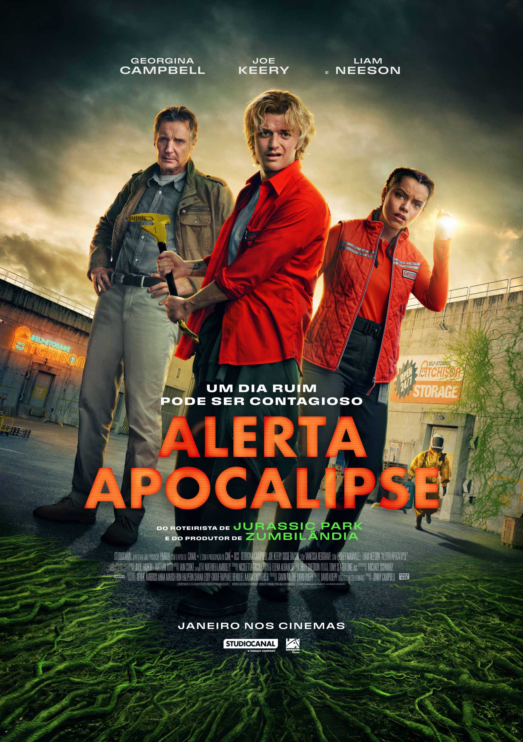Em Alerta Apocalipse, Joe Keery e Georgina Campbell vivem funcionários de uma empresa de armazenamento que se unem a um ex-agente bioterrorista para tentar conter um microorganismo mutante que escapou de uma antiga instalação militar. O veterano é vivido pelo astro Liam Neeson, indicado ao Oscar por "A Lista de Schindler" (1993) e protagonista da franquia "Busca Implacável". O elenco ainda conta com as britânicas Vanessa Redgrave, vencedora do Oscar por "Julia" (1977), e Leslie Manville, que concorreu ao prêmio da Academia por "Trama Fantasma" (2017).