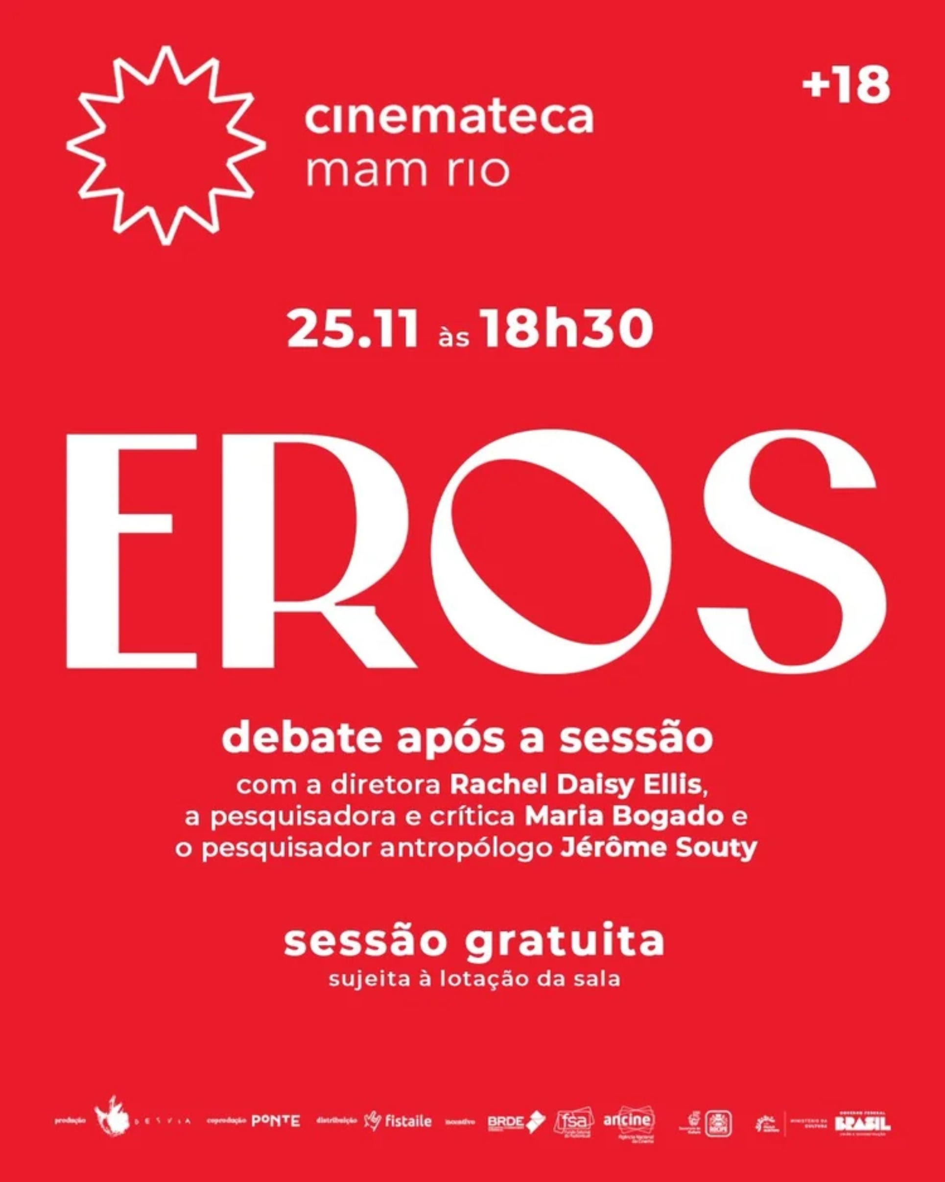 No dia 25/11 (terça-feira), às 18h30, EROS, primeiro filme dirigido por Rachel Daisy Ellis, terá uma sessão debate gratuita na Cinemateca do MAM que marca a estreia do filme no Rio de Janeiro. O evento contará com a presença da diretora Ellis, da pesquisadora e crítica Maria Bogado e do pesquisador e antropólogo Jérôme Souty. Ao final da sessão, também ocorrerá um sorteio com brindes picantes e especiais.