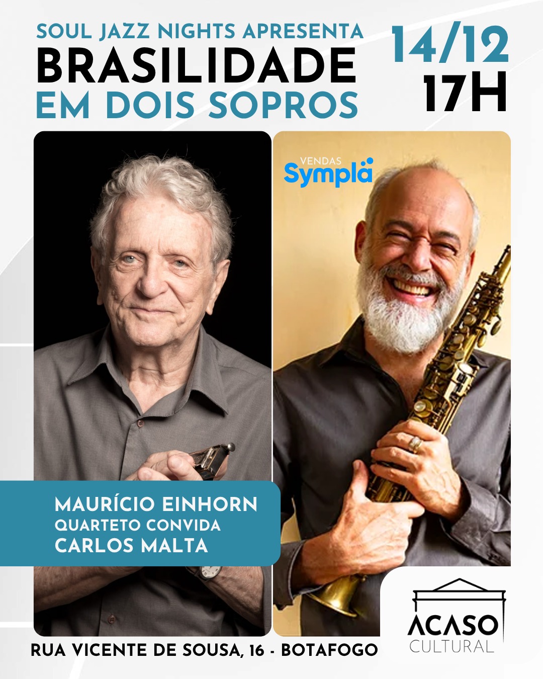 O projeto Soul Jazz Nights, idealizado e produzido por Luciana Moisakis, estreia uma nova etapa de sua trajetória no dia 14 de dezembro, domingo, às 17h. Reconhecido pela itinerância e pela qualidade artística de suas edições, ele amplia seu alcance ao ocupar um dos novos espaços de destaque no circuito carioca: o ACASO Cultural, em Botafogo. E para marcar essa retomada, apresenta o concerto inédito “Brasilidade em Dois Sopros”, que reúne Maurício Einhorn e Carlos Malta, dois nomes de referência absoluta na música instrumental brasileira.