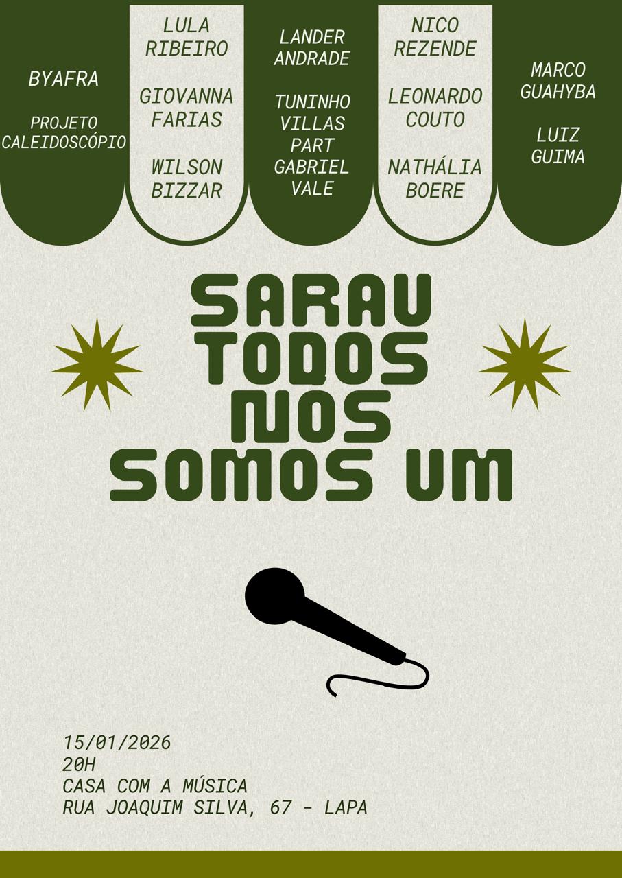 O movimento de artistas “Todos Nós Somos Um” realiza o seu primeiro sarau em 2026 no ponto de cultura Casa com a Música, na Lapa, no dia 15 de janeiro, quinta-feira, às 20h. Será uma noite muito especial marcada pela homenagem à cantora e compositora Giovanna Farias, filha do lendário compositor e cordelista paraibano, Vital Farias.