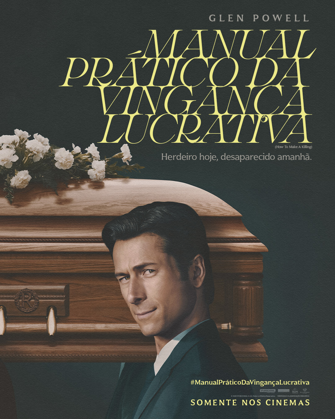 A Diamond Films acaba de revelar o pôster oficial de MANUAL PRÁTICO DA VINGANÇA LUCRATIVA (“How to Make a Killing”), novo longa da A24 estrelado por Glen Powell (“Assassino Por Acaso”). Com estreia marcada para 26 de fevereiro nos cinemas de todo o Brasil, a produção escrita e dirigida por John Patton Ford (“Emily, a Criminosa”) propõe uma sátira sagaz sobre ambição e poder na sociedade americana a partir da irreverente jornada de vingança de um trabalhador.