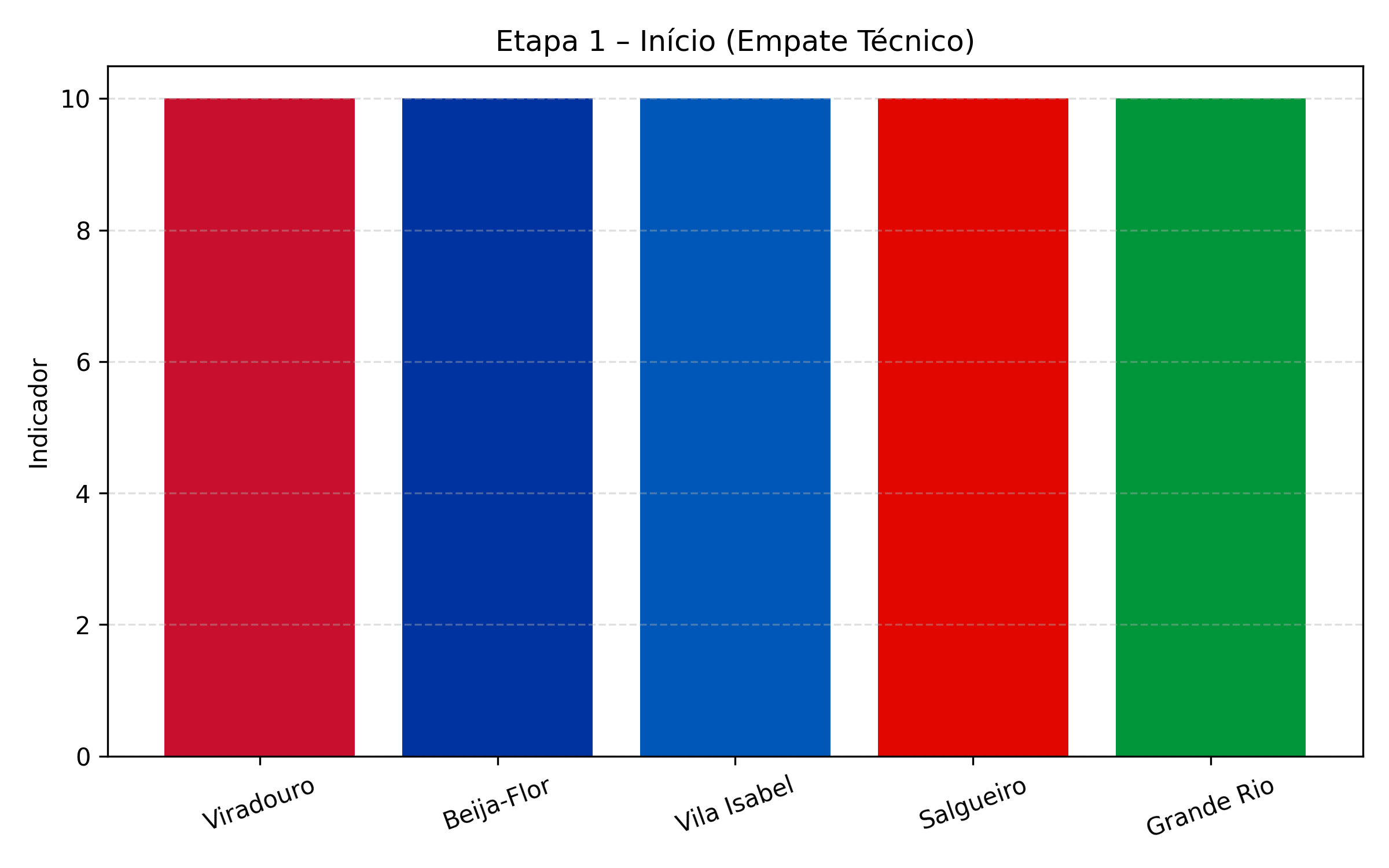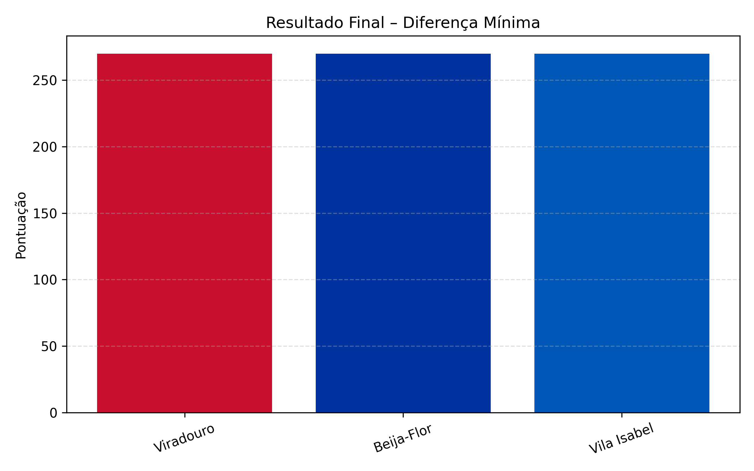 Mesmo após assumir a liderança, a diferença nunca foi confortável. Faltando dois quesitos — enredo e evolução — a vantagem era de apenas 0,1 ponto.