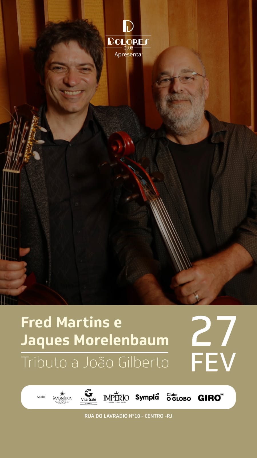 Dois grandes nomes da música brasileira, Fred Martins e Jaques Morelenbaum sobem ao palco do Dolores Club, na Lapa, para uma linda homenagem ao mestre João Gilberto, celebrando a sofisticação e a delicadeza da MPB. O concerto acontece no dia 27 de fevereiro, sexta-feira, às 20h30.
