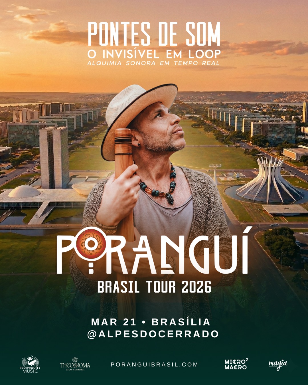 A capital federal recebe, pela primeira vez, o artista internacional Poranguí, referência global em live looping e música de raízes ancestrais. No próximo sábado, dia 21, o músico apresenta, das 16h às 22h, a turnê "Pontes de Som – O Invisível em Loop", no espaço Alpes do Cerrado, em um encontro que une performance musical, experiência sensorial e celebração coletiva. A abertura do show será de Alisson Sindeaux, músico da floresta e guardião de projetos de regeneração planetária, incluindo o Instituto Regenera Hub.