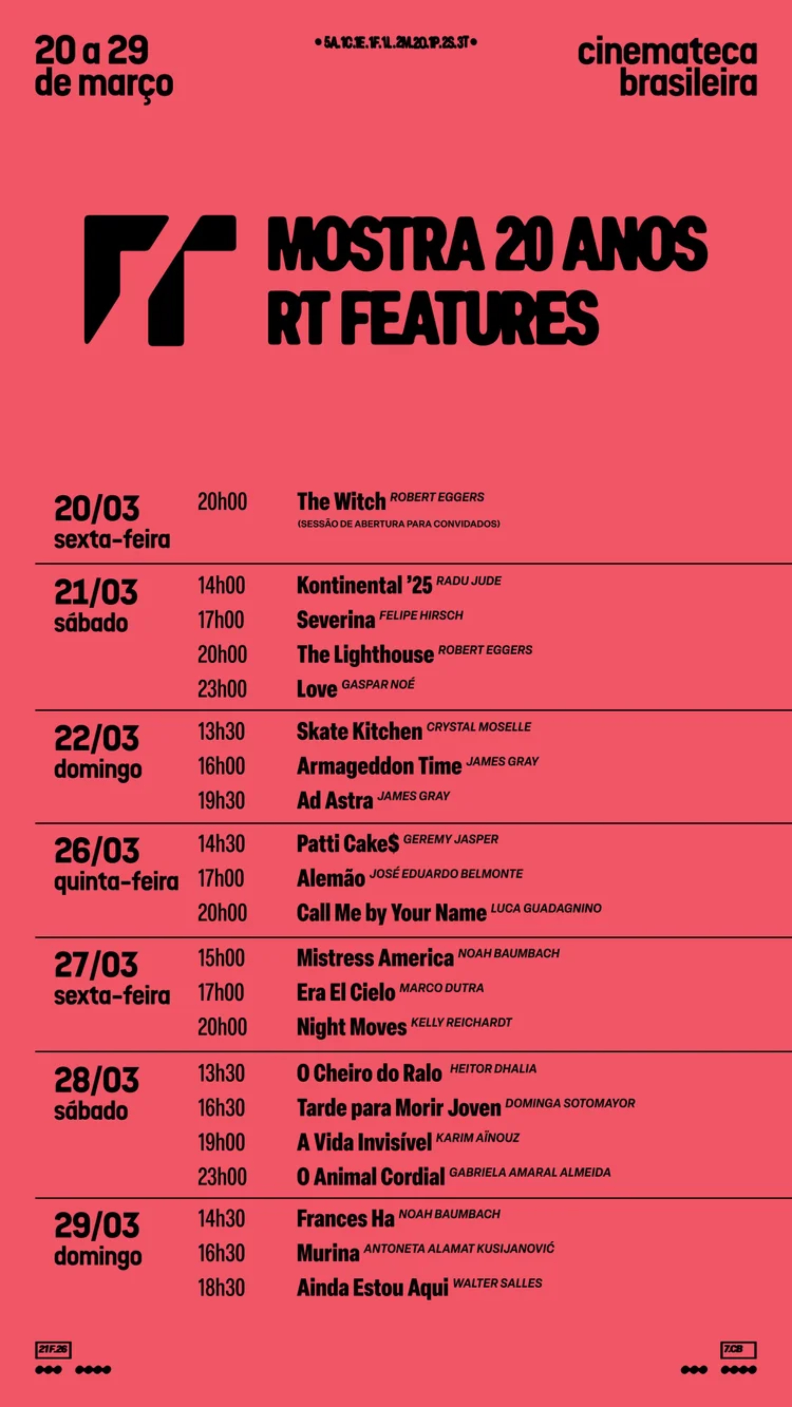 Na sexta-feira, dia 20, será a abertura da MOSTRA 20 ANOS RT FEATURES, um evento exclusivo para alguns convidados e com exibição do filme The Witch (A Bruxa), de Robert Eggers. A partir de sábado, dia 21, a Mostra será inteiramente aberta ao público, com ingressos gratuitos, e se estende até dia 29 de março. Abaixo, veja a programação completa: