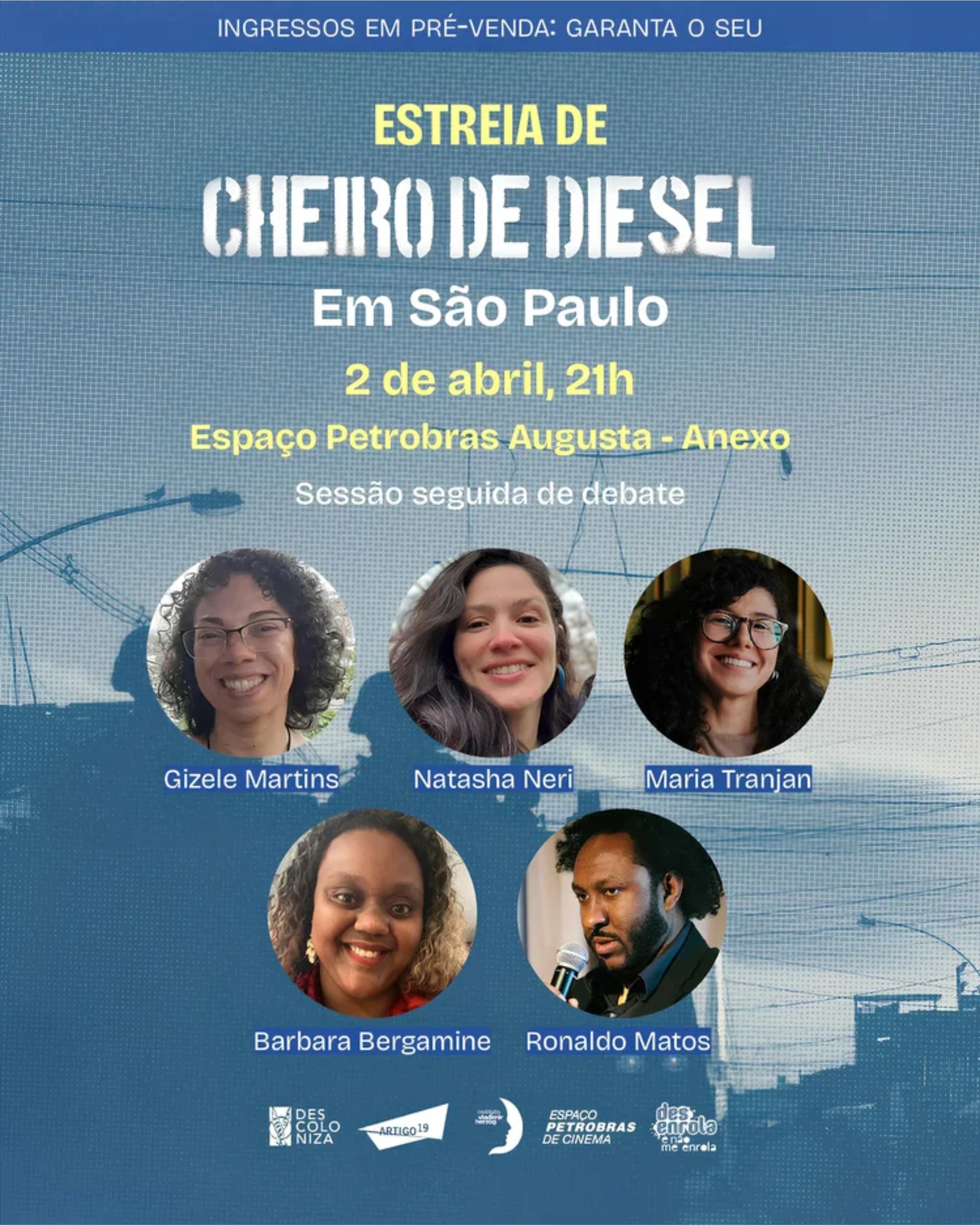 No dia 2 de abril, data de sua estreia nacional nos cinemas, o documentário CHEIRO DE DIESEL, dirigido por Natasha Neri e Gizele Martins, ganha uma sessão especial seguida de debate em São Paulo. O evento acontece às 21h, no Espaço Petrobras Augusta – Anexo, e contará com a presença das realizadoras e de convidadas e convidados que atuam na defesa dos direitos humanos, da liberdade de expressão e da comunicação.